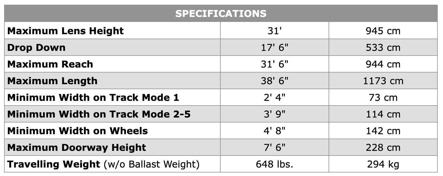 Ultra-light, modular design, either manned or remote, the Giraffe Classic was designed for space efficiency. Tapered sections nest inside each other, making it easily transportable, in light vans, small airplanes, helicopters and boats. Can be hand-carried up mountains, and hard-to-reach locations. This modular flexibility is also easy on the budget. Fast and verstaile, the Giraffe Classic crane is the backbone of our fleet.